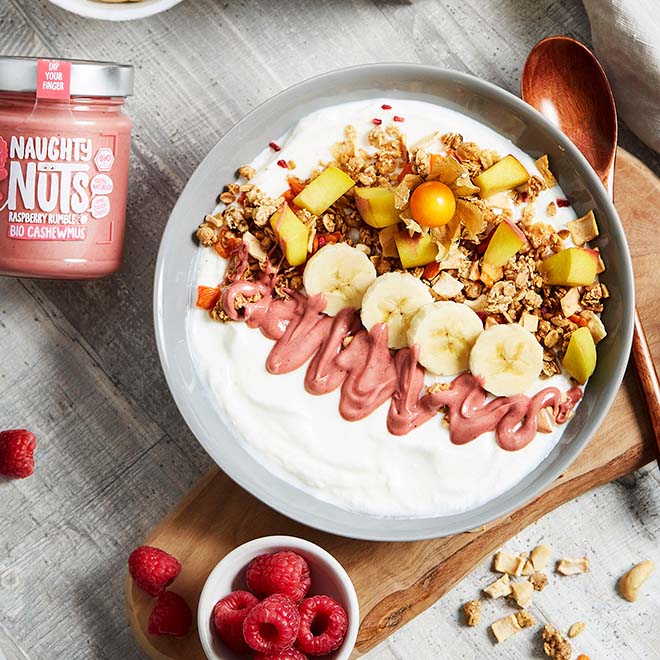Smoothes Mandelmus, Kokosnuss, fruchtige Blaubeeren und süße Agave laden Dich in unseren beerig-süßen Nutty Heaven ein! Der unwiderstehliche Blueberry Taste unseres ballaststoffreichen BIO Mandelmuses Blueberry Bash lässt einfach jedes Gericht – egal ob herzhaft oder süß - zu einem naughtylicious Highlight werden!