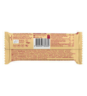 Zutaten: Reissirup*, Cashewkerne*, weiße Schokolade* (Kokosblütenzucker*, Kakaobutter*, Kokosnusscreme*, Mandelprotein*, Kokosmehl*, Emulgator: Sonnenblumenlecithin*), Kokosmehl*, Kakaobutter*, getrocknete Kirschen*, Kirschpulver*.