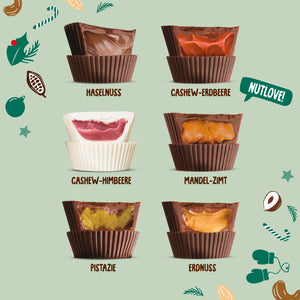 Dich erwarten 6 verschiedene Sorten: Haselnuss, Pistazie, Mandel-Zimt, Erdnuss, Erdbeere und Himbeere – darunter einige exklusiv nur im Kalender.
